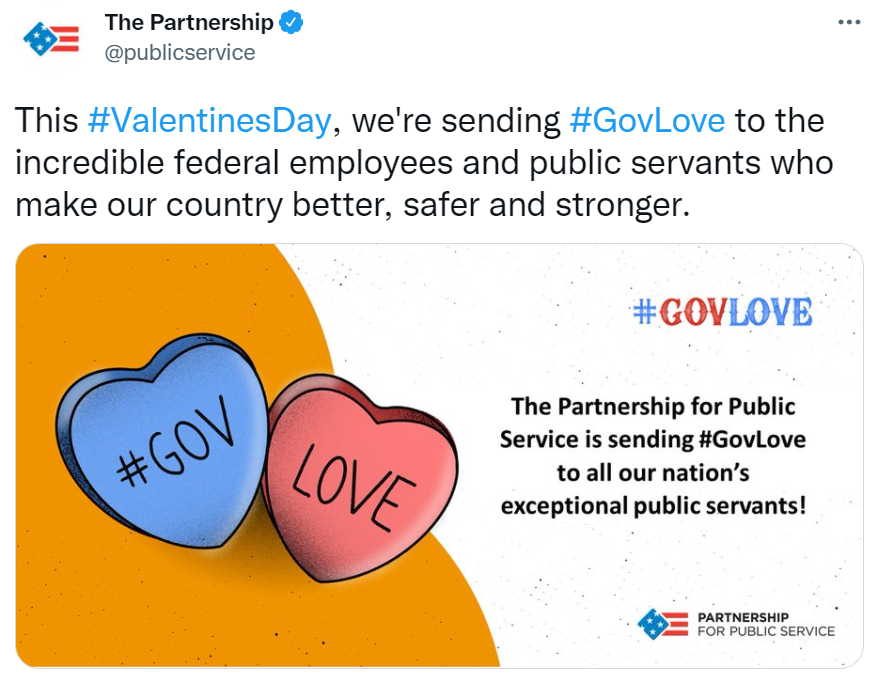 Image of a tweet with text: This #ValentinesDay, we're sending #GovLove to the incredible federal employees and public servants who make our country better, safer and stronger. and a social card